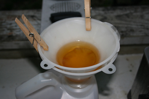 Now let's figure you're going to save some oil to be reused. Let's now look at filtering... that's a key to the reduction of bacteria growth. How can we filter it quickly and in a simple manner? Two funnels and coffee filters or paper towels.