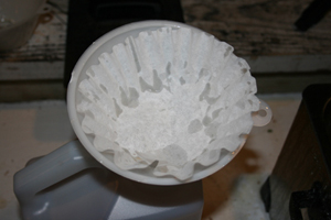 Now, take a coffee filter and put it in the bottom of the uncut filter and put the other cut funnel on top of it. Below is setting the filter in place in the uncut filter, then put the cut funnel on top of it.